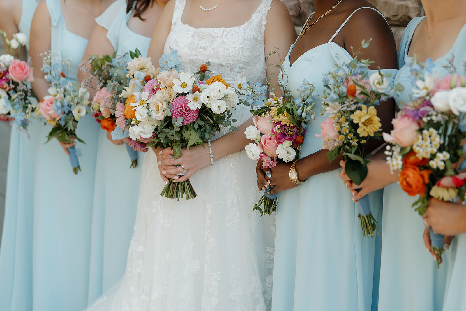 Iowa summers are green, bright, and golden all at once, and that environment is already doing a lot visually before your colors even enter the picture. Sometimes the harsh midday sun flattens certain tones, rich green backgrounds swallow others, and then golden hour comes around and completely transforms everything again. Choosing wedding colors for a summer wedding means thinking about how your palette behaves across all of those conditions, not just how it looks on a swatch in your living room.